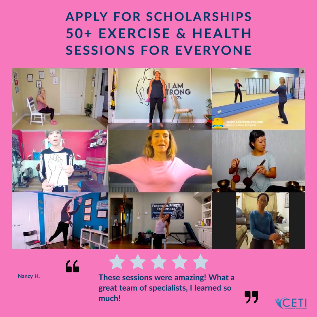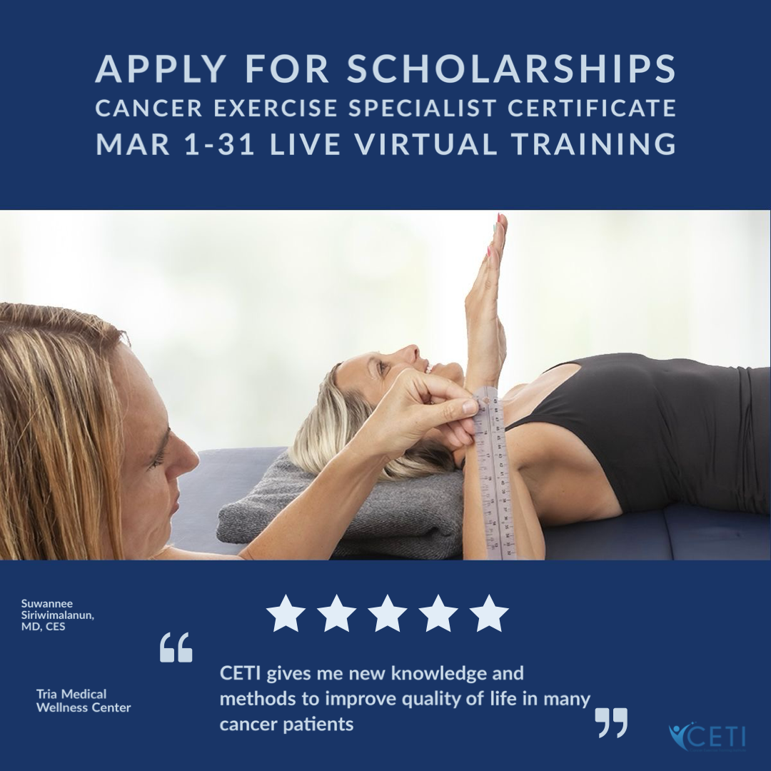 100% Scholarship: Can be used for either the Cancer Exercise Specialist Live Virtual Training Program, or for the Cancer Exercise Specialist Advanced Qualification self-study course, both available at ceti.teachable.com.