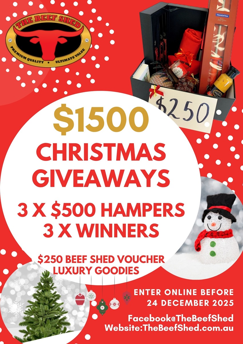 11. The prize is as follows: 1. THE BEEF SHED Vouchers $250. 2. THE BEEF SHED HAMPERS. Total Value of $500 x 3 to be collected in store at The Beef Shed, 26 Pavers Circle Malaga 6090.